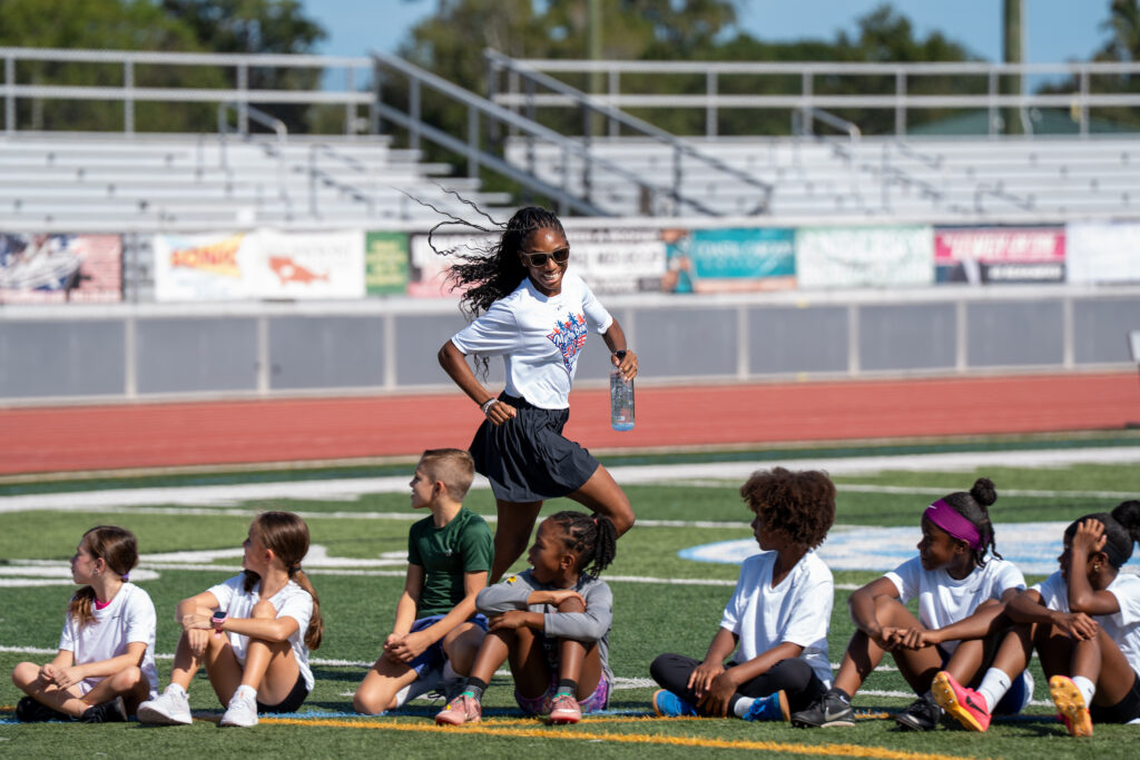 Known as the fastest woman in the world this year with a 100m time of 10.65 seconds (tied No. 5 all-time), and the first American woman ever to win both the 100m and 200m at the World Championships, Jefferson-Wooden didn’t come home to compete, she came home to invest in the next generation of athletes.